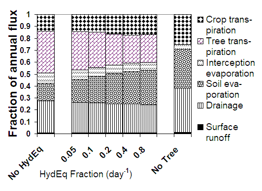 The Water balance of the system includes rainfall and canopy interception, with the option of exchange between the four zones by run-on and run-off as well as subsurface lateral flows, surface evaporation, uptake by the crop and tree and leaching. Vertical as well as horizontal transport of water is included; an option is provided to incorporate (nighttime) ‘hydraulic equilibration’ via the tree root system, between all cells in the model.