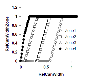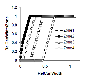 The canopy can expand both towards the right and towards the left of the tree position and will ‘spill over’ into the next zone to the left or right when it reaches the zone boundary. As indicated by the arrow in Figure 2.2, when the tree is not in the middle of the zone, it will reach one boundary before the other, and the rate of increase of RelCanWidth[Zone] will be half of what it was before at the time the next zone starts to fill.