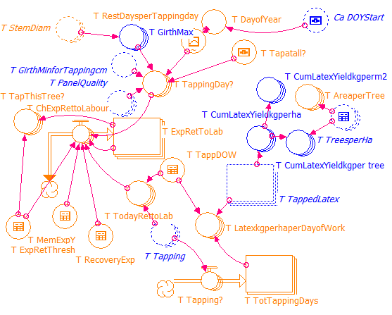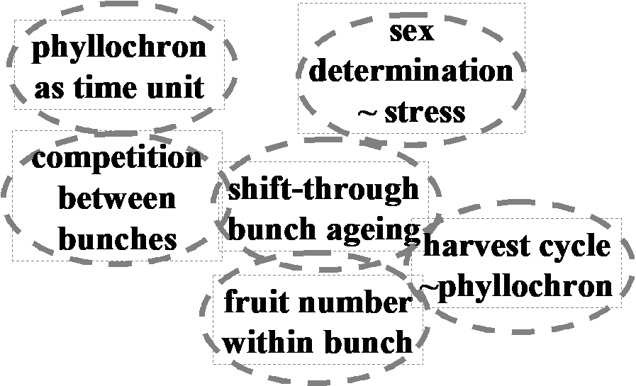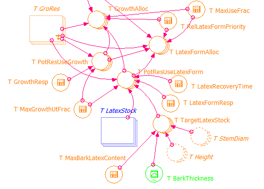 Growth of both plants (‘crop’ and ‘tree’) is calculated on a daily basis by multiplying potential growth (which depends on climate) with the minimum of three ‘stress’ factors, one for shading, one for water limitation, one for nitrogen and one for phosphorus. For trees a number of allometric equations (which themselves can be derived from fractal branching rules) is used to allocate growth over tree organs.